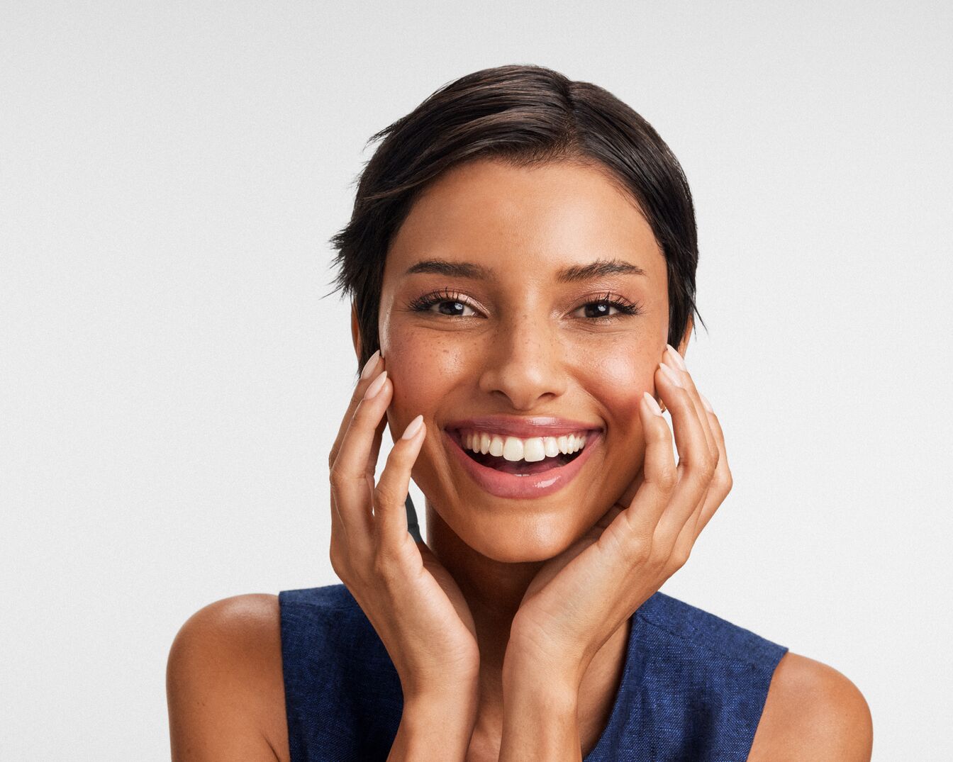 Uśmiechnięta kobieta z krótkimi, ciemnymi włosami, delikatnym makijażem i piegami, dotyka dłońmi policzków, prezentując promienny wygląd.